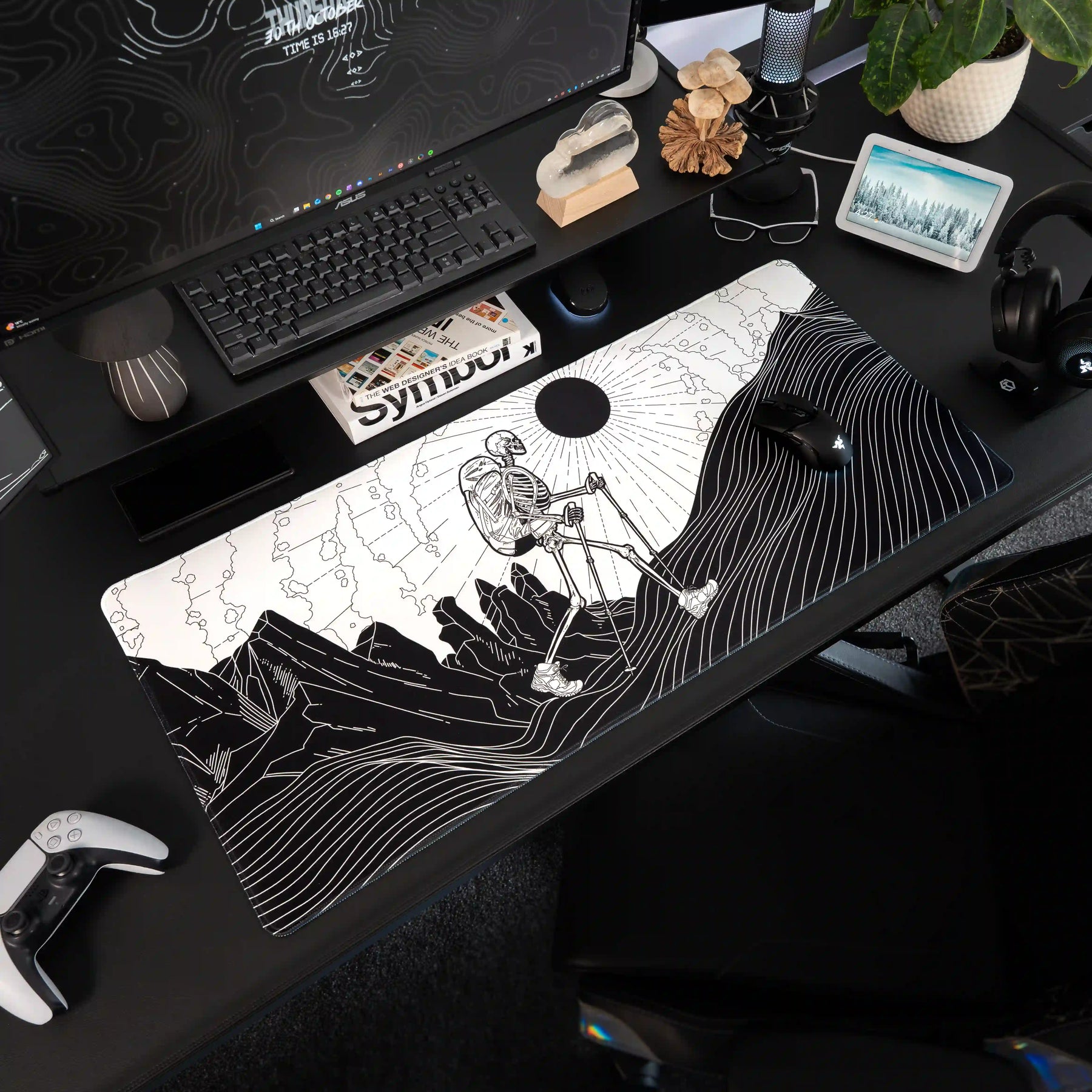 Bare Boned Expedition – An otherworldly monochrome masterpiece, over jagged black peaks traced in fluid white lines, a lone skeletal adventurer pushes onward. Above, an abstract white sky and looming black sun cast an eerie stillness over the scene. A bold, high-contrast design that transforms your desk into a surreal expedition.