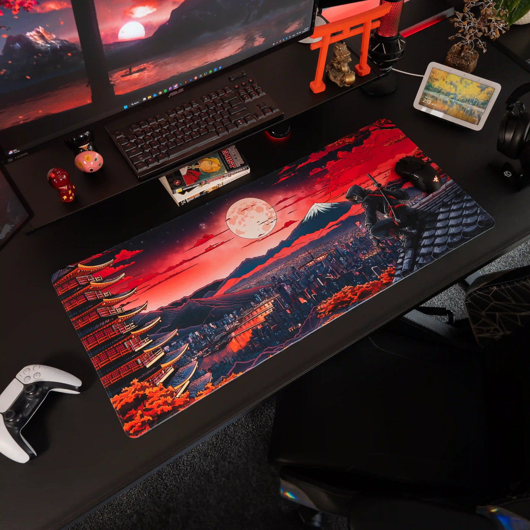 Crimson Shadow – Perched atop a mountain temple, a lone ninja overlooks a sprawling valley city bathed in the glow of a colossal moon and a crimson red sky. Every detail, crafted over 100+ hours, captures the essence of stealth, solitude, and cinematic beauty.