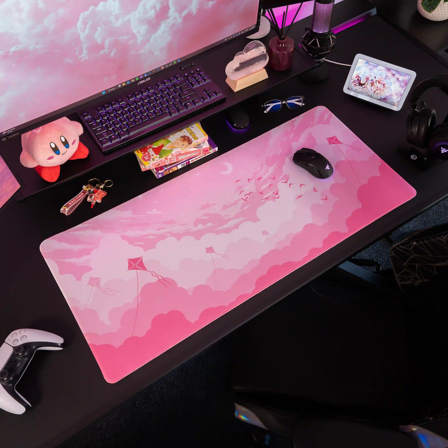 Pink Dreams – Drift through a dreamy sky where cotton candy clouds float endlessly, birds glide with elegance, and colourful kites dance in the breeze. This whimsical, pastel-pink scene captures an ethereal sense of wonder, turning your desk into a serene, surreal escape.